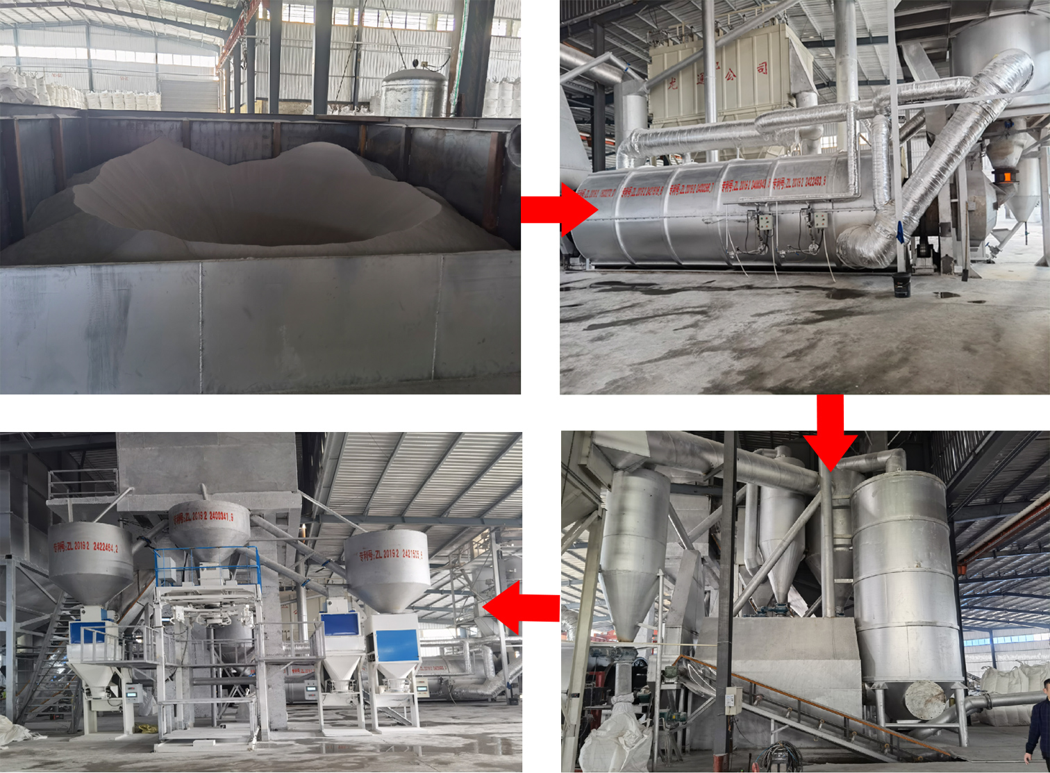 一次性可投放100T原材料,料倉(cāng)側(cè)壁有收風(fēng)口收塵,物料經(jīng)過(guò)輸送帶輸送至預(yù)熱爐中,預(yù)熱爐為雙層滾筒,大筒與小筒互套在一起,物料直接進(jìn)入到內(nèi)筒中,通過(guò)烘干、預(yù)熱、脫水處理,處理結(jié)束后經(jīng)提升機(jī)提升至膨化爐中對(duì)物料進(jìn)行膨化,主爐膨化后的產(chǎn)品柔性回流至預(yù)熱爐中心筒經(jīng)過(guò)余熱回收管理系統(tǒng)收集余熱后,進(jìn)入金輝專利技術(shù)懸浮法五級(jí)風(fēng)選(把未完全閉孔的產(chǎn)品分類收集),風(fēng)選過(guò)后的產(chǎn)品進(jìn)入成品倉(cāng)通過(guò)輸送機(jī)提升至柔性篩分系統(tǒng)(把未完全膨化的燒結(jié)砂篩除掉),最終經(jīng)過(guò)級(jí)配管道流入定量包裝系統(tǒng)進(jìn)行包裝,以上程序可以保證松銤維鉑的閉孔率和漂浮率,金輝公司宗旨是以高品質(zhì)產(chǎn)品服務(wù)于市場(chǎng)。